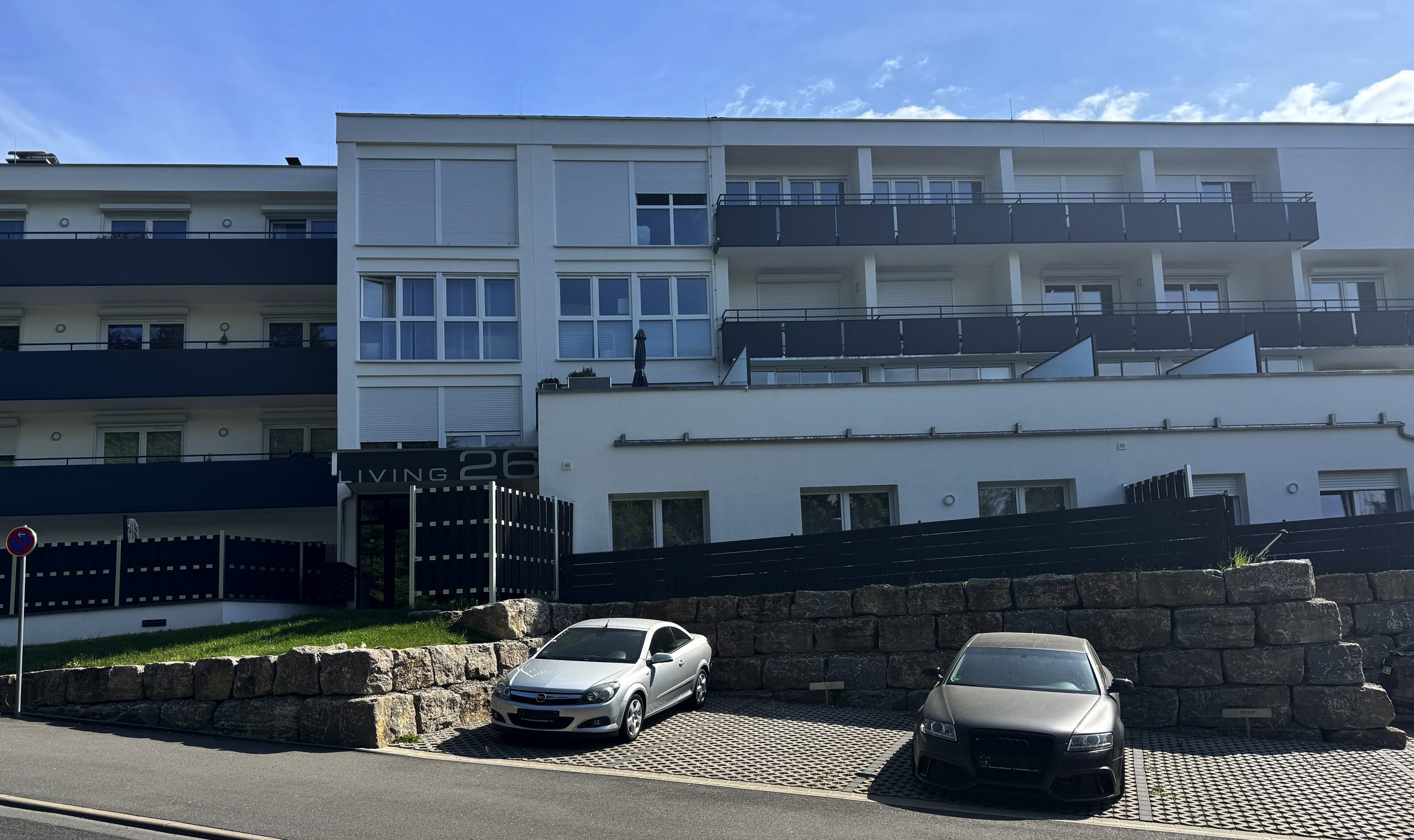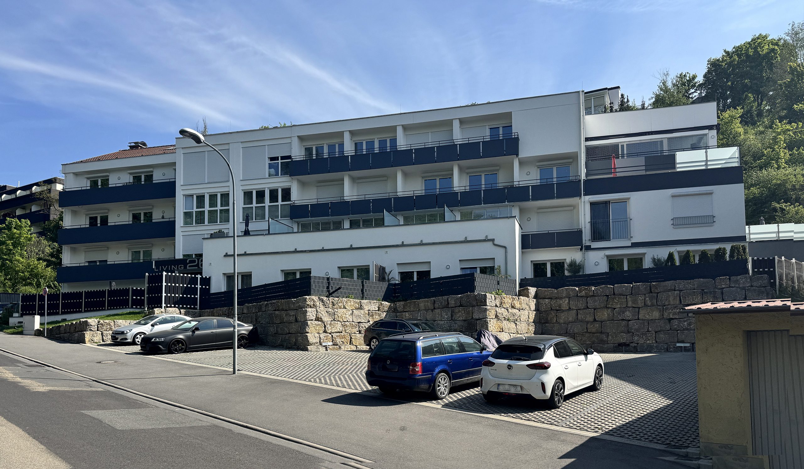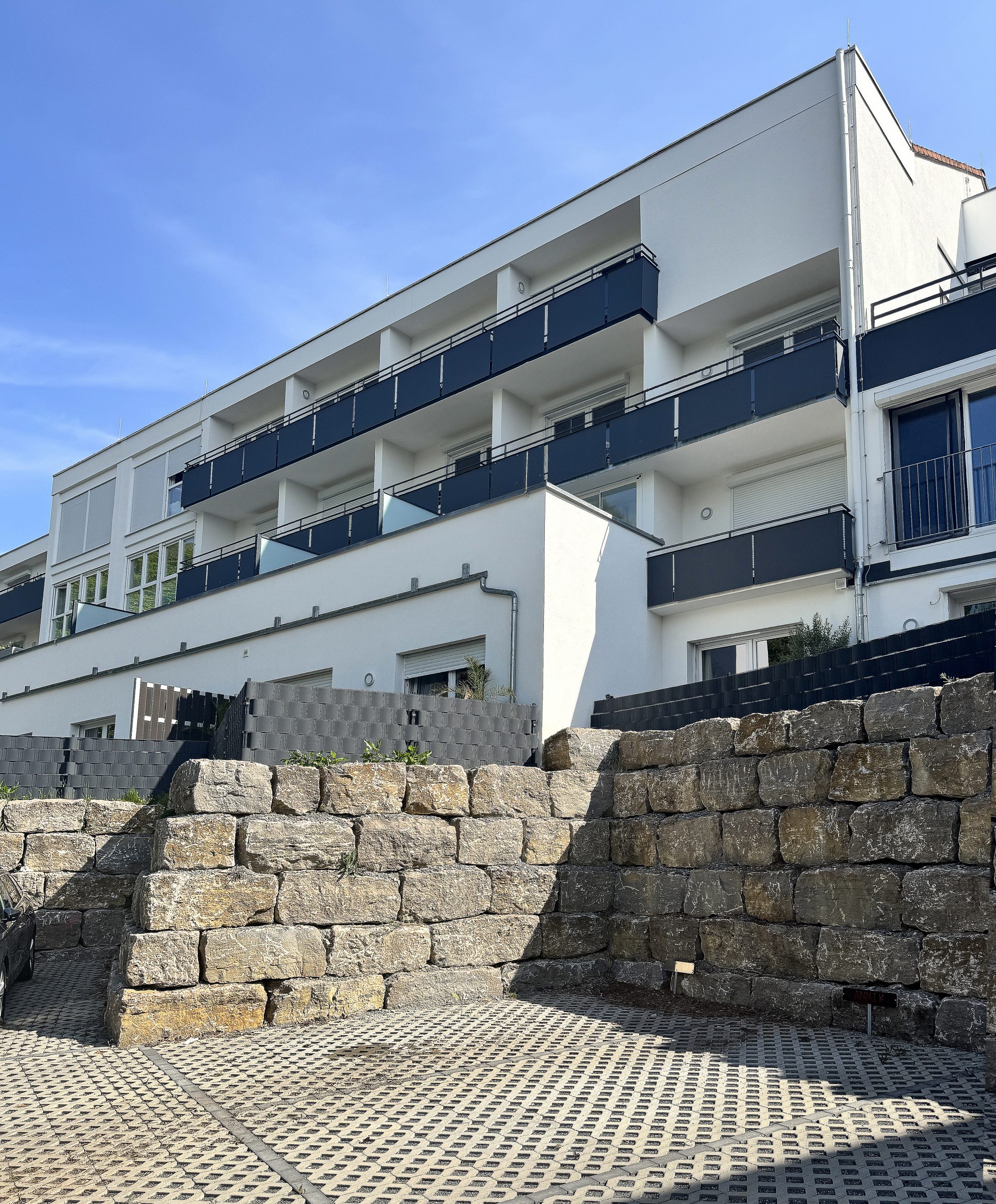 Natursteinmauer dient als Abgrenzung der Parkplätze